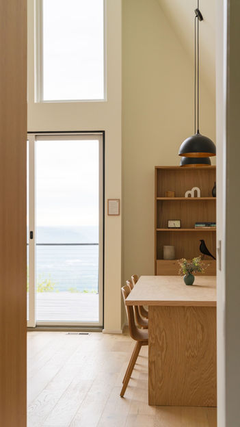 The interior is beautifully crafted with custom white-oak cabinets and furniture, creating a warm and inviting atmosphere that blends perfectly with the surrounding natural environment.